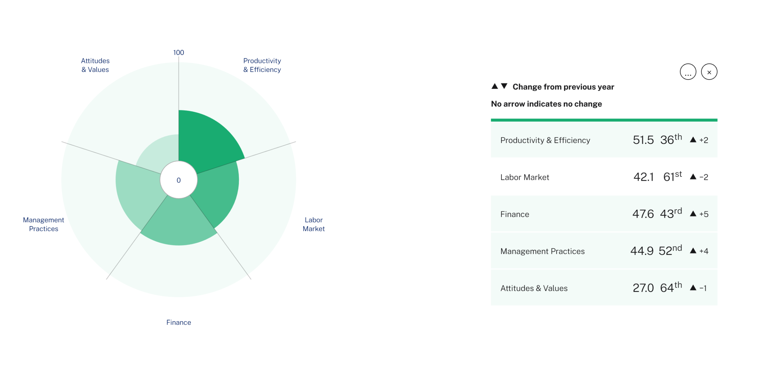 V Sloveniji imamo na tem področju veliko razvojno priložnost, saj je bil na letošnji IMD-jevi lestvici konkurenčnosti element odnosov in vrednot najslabše ocenjen (64. mesto od skupaj 69 vključenih držav). Ne zgolj znotraj poslovne učinkovitosti, ampak med vsemi elementi konkurenčnosti. Pri tem v ospredje stopajo predvsem: